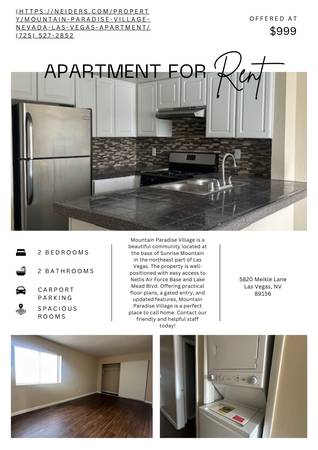 Looking for a spacious and affordable apartment in a convenient Las Vegas location? Mountain Paradise Apartments offers beautiful 2 bedroom homes designed for comfort, value, and easy living!