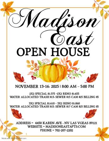 Madison East is a beautiful community conveniently located near the US-95 freeway entrance, local groceries and Boulder Station casino for entertainment. We are at walking distance from Jerome Mack Middle School, short distance from Laura Dearing Elementary and Chaparral High School. We offer 2 and 3 bedroom apartments with all kitchen appliances including refrigerator, gas stove and dishwashers. Your home will have several features like a food pantry, beautiful ceiling fans, storage closets, a private patio and laundry area with an included washer and dryer! You will love to be home, you can enjoy a nice day out by the pool, playground, and picnic area with our community grills. Also take advantage of our fitness center and lounge area at the front office!