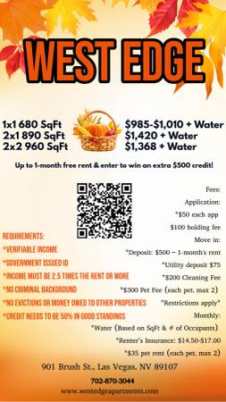 MOVE IN SPECIAL PRICES ON SELECT UNITS! APPLY TODAY AND GET UP TO 1-MONTH FREE RENT! MOVE IN BY 11/30/25 AND YOU'LL BE ENTERED TO WIN AN EXTRA $500 CREDIT! CALL US TODAY!!