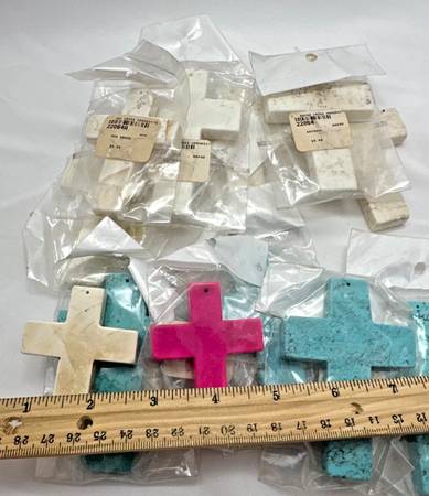 10 pieces of Magnesite Crosses Various Sizes and Colors 4 ~ white measures approx. 3 1/2" x 2 1/2" x 1/2" 3 ~ turquoise measures approx. 3 1/2" x 2 1/2" x 1/2" 2 ~ white measures approx. 2 3/4" x 2"...