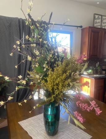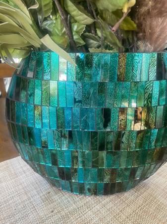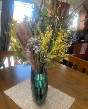 One beautiful mosaic blue/green vase with colorful faux flower arrangement included for $12. The vase is approximately 8x12 inches without flowers and 27x12 with them included.