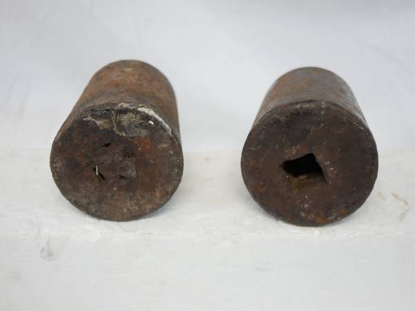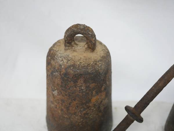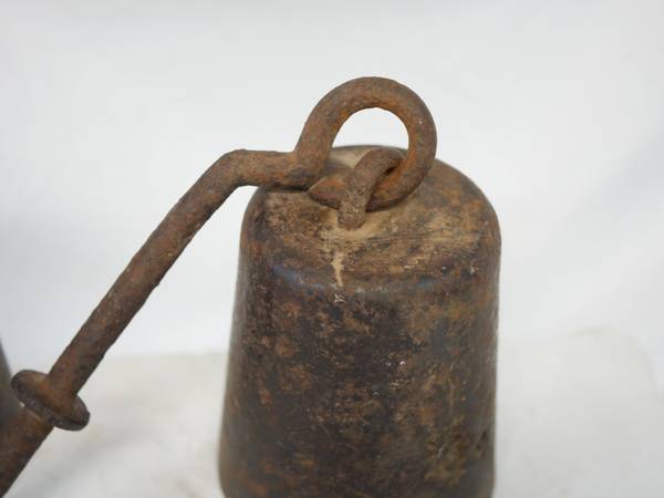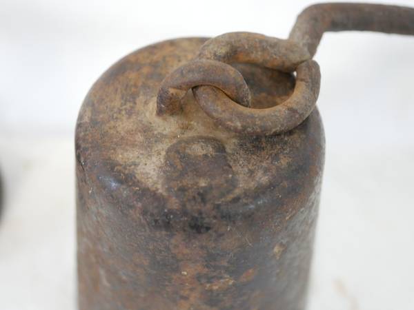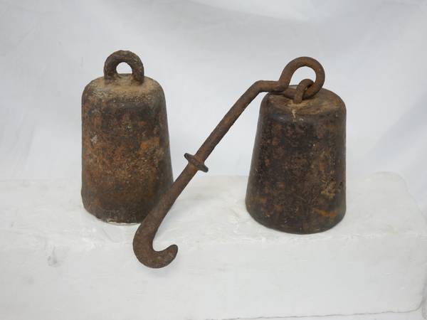 2 Antique Cast Iron Counter Balance Hanging Scale Weights they are about 7 + lbs each $20.00 for the pair I am on the west side of Las Vegas