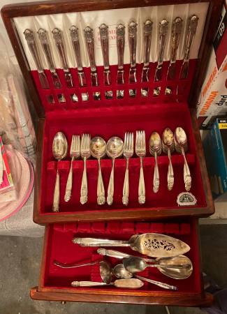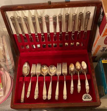 Holmes & Edwards Inlaid Silver Wedding Flatware FULL SET, Walnut Box...