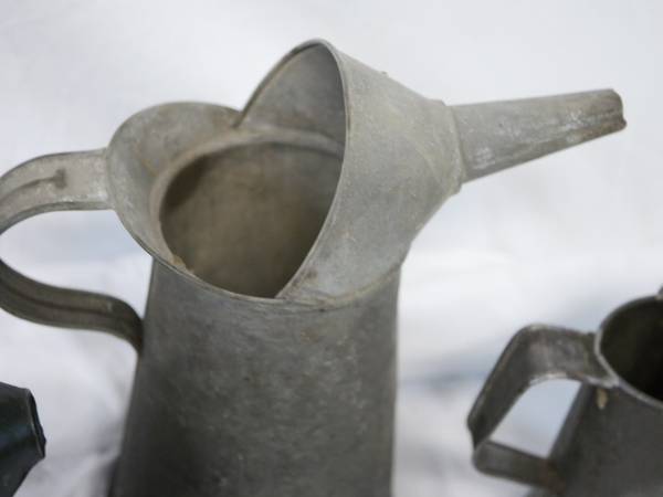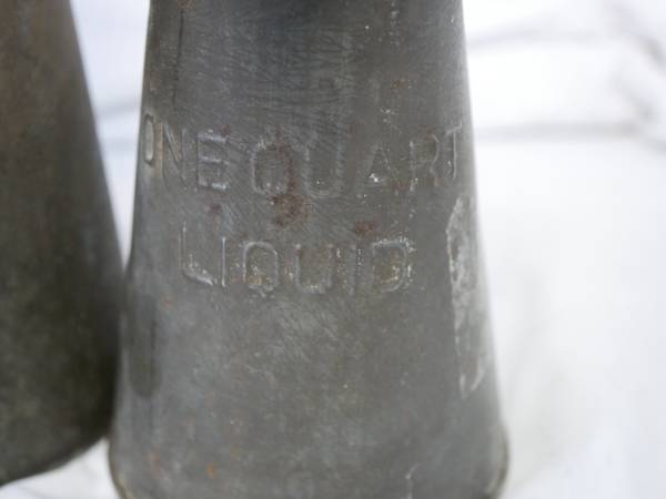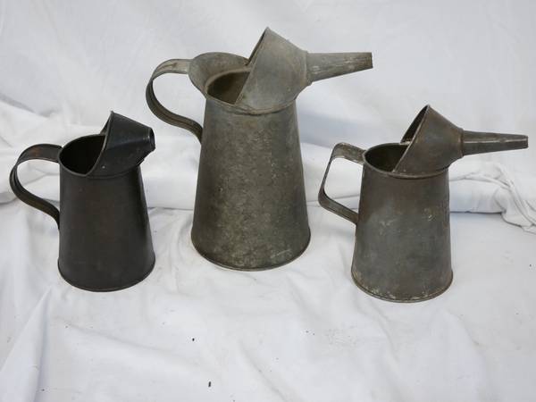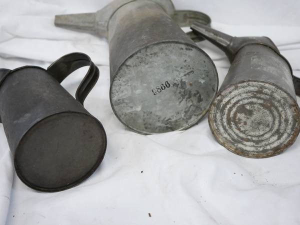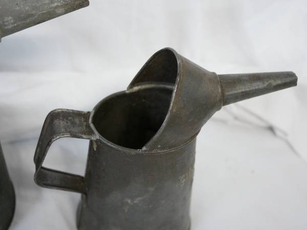 3) Vintage Antique 1 Qt. + 2 Qt. Oil Fuel cans with Funnels all are in good used shape- see pics $30.00 gets all 3 I am on the west side of Las Vegas