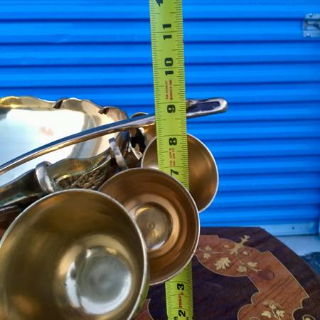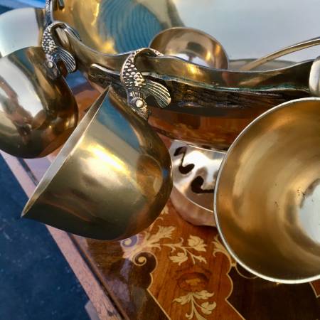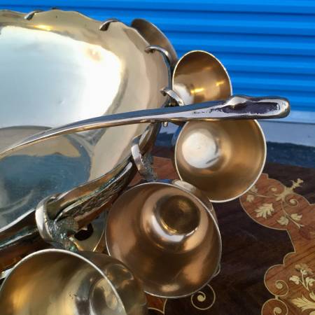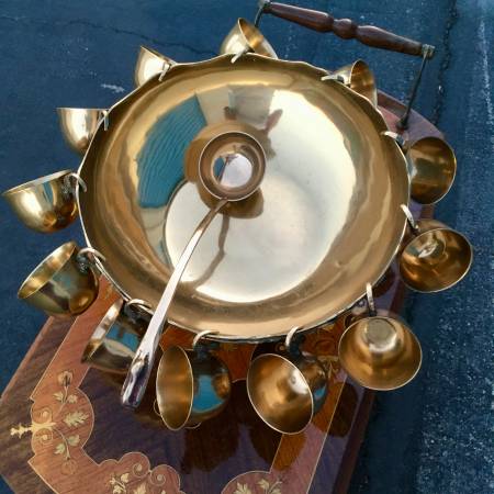 Very beautiful and good condition vintage solid brass punch bowl with solid brass ladle and 12 solid brass cups. This is a vintage piece handmade in India that isn't super rare but is a lovely statement piece For your dining room or formal event