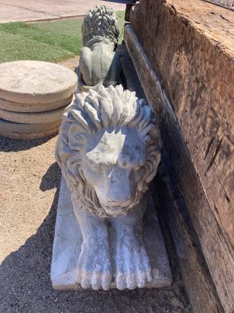 Vintage pair of cement lions has 1 knee in need of repair and a paint job but otherwise in great solid condition come see anytime in my front yard. Also have tons of vintage architectural supplies...
