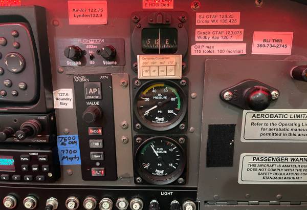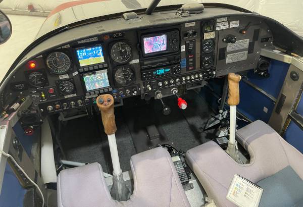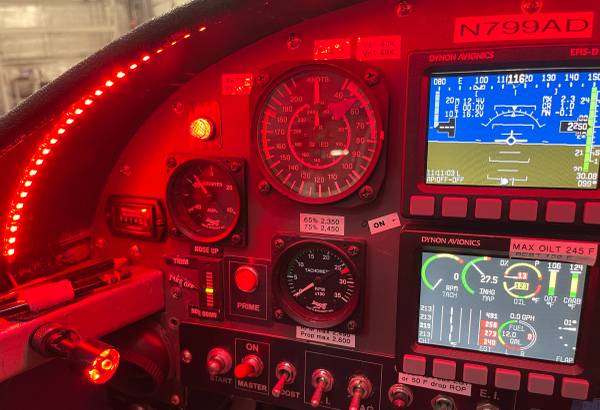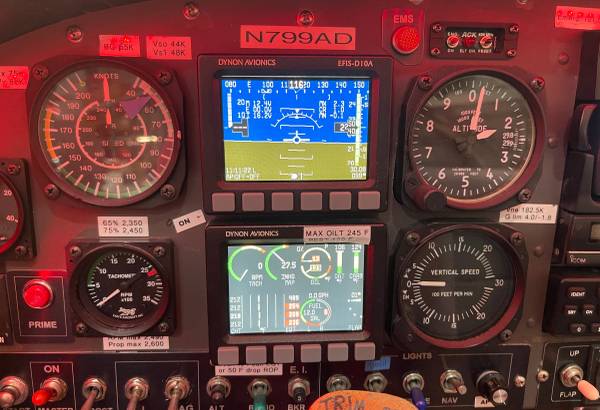 Dynon EFIS-D10A color display with angle-of-attack indicator, Dynon 2-axis autopilot with AP74 controller, Dynon EMS-D10 engine monitor, Garmin GPSMAP 496 with XM weather/radio, Appareo Stratus ESG ADS-B in/out transponder, Icom IC-A200 panel radio with backup handheld, FliteCom intercom, Airpath liquid compass, and 406 MHz ACK ELT.