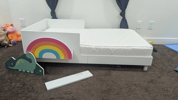 Toddler Bed Frame & Mattress need to be gone! Adjustable bookshelves, rainbow, white board or dinosaur. Must pick all Assembled dimensions 28,5"W x 52.75"D x 16.5"H PICK UP ONLY AS IT IS! Smoke...