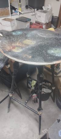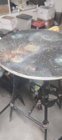 For man cave, she shed, garage, patio, studio. Hand painted with planets. Universe. True commercial refrigerator,single door very cold. No freezer. Glass front. $475. High top wrought iron table and chair matching. Can buy all together or separate. Table and chair $125. Call Tiffany any time delivery not available. Bring truck