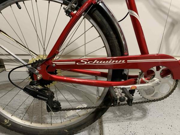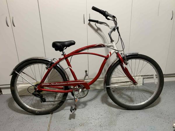 Red Schwinn Cruiser Bike, 26 Inch Bike for Women and Men, 7-Speed Beach Cruiser Bicycle, Linear Pull Brakes, Comfortable Padded Seat, Upright Riding Position, Adult Bicycle