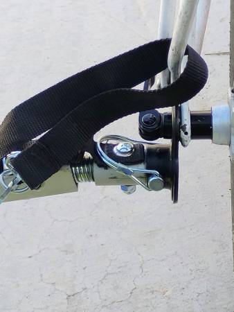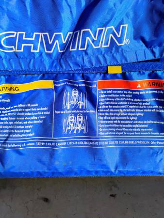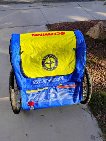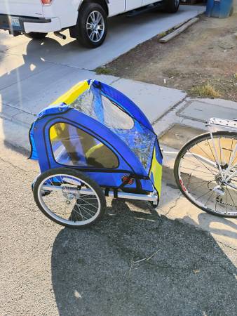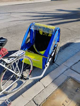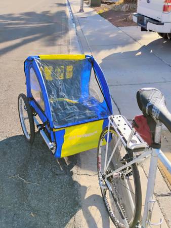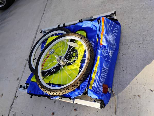 Children's bike trailer, holds 2 or one in the middle. Attaches, disconnects, and folds down in seconds.20 inch wheels make for a smooth ride, storage in the rear. Trails behind your bicycle easily so that you hardly even know that it's there. Can deliver.
