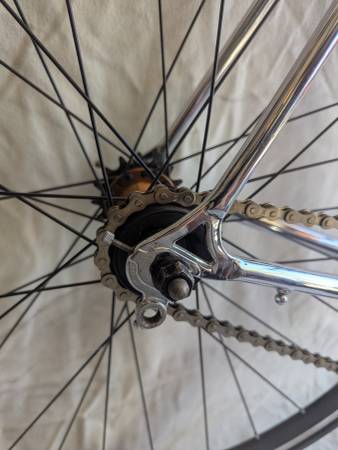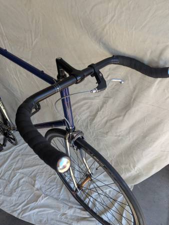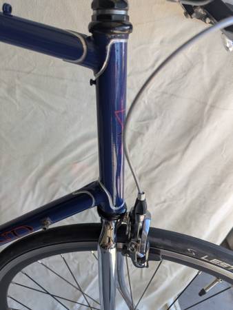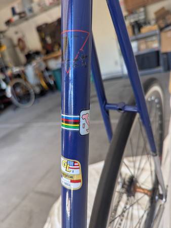 Regrettably selling my very early (pre-1990) Lemond steel road bike frame. Made in Italy with French Excell 'Special steel' tubing, presumably by Bilato, this pre-dates when Greg Lemond started having mass produced bikes made for him by various frame makers. Time to face reality that this bike is too big for me. It's a piece of history that I wanted to keep, but need to make some space. The whole frame is chrome, but upper part painted a dark blue. Frame is in good shape, with some wear shown. Stickers are in very good shape. Right now, set up as my 'hipster bike' - single speed with a flip-flop rear hub, can turn it around and run fixed if desired. Sporting a sweet vintage Selle Italia black and red saddle with a nice Thompson seat post, Bull horn handle bars and an Ultegra front brake. Or, if you only want the frame and fork, I can remove the components and sell the frame and fork separately. It still has it's derailleur hanger, shifter bosses, and all cable routing to set it back to a standard road bike if you have a vintage group set from the late 80's. I might also have some suitable parts to start that process. It's a 25" (63.5cm) very tall frame for taller folks, and the chrome fork is not the original. For 700c wheels, rear spacing is 120mm, suitable for 5 or 6 speed hubs. Could probably be spread a little to accommodate a 7 speed hub. $650 as is in 'Hipster' format, frame and fork with Italian threaded bottom bracket and no name headset only for $500. Email, text or call Joe - 3O3-886-628five.