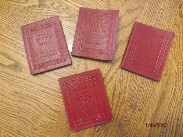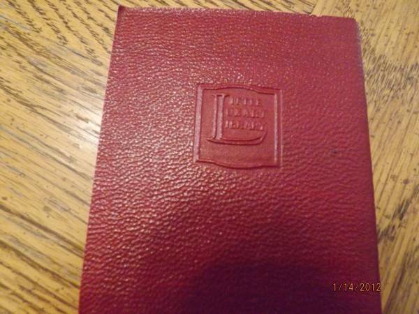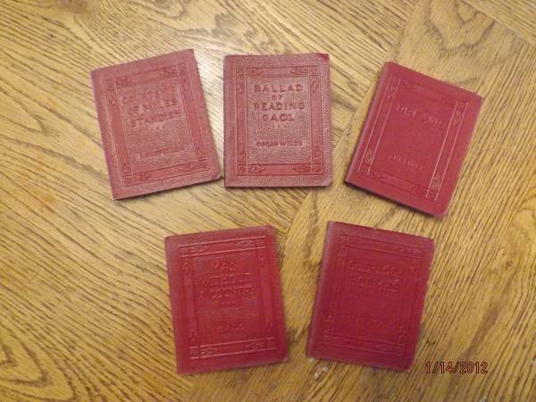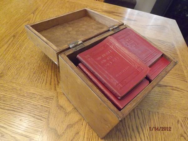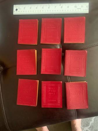 All 30 of the "Little Luxart Library' of miniature leather books, various titles. All are in very good condition considering they are over 100 years old. Normal drying out of the covers, but not bad at all. Browning of most title pages but text in good shape on all. Also have one title in black leather with original quote card enclosed and original mailing box with stamp from 1924. Beautiful gold leafed, very sturdy wooden box that holds all 30 books plus the one black one.