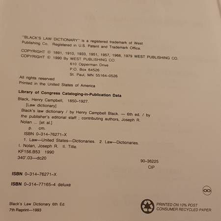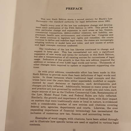 This is the Sixth Edition of Black’s Law Dictionary (Centennial edition), published to commemorate 100 years of Black’s (1891-1991). It includes pronunciations, Latin pronunciations, transcription system, appendices (Constitution, Supreme Court time chart, U.S. Government Org chart, British Regnal Years, etc.). A serious law / reference book.