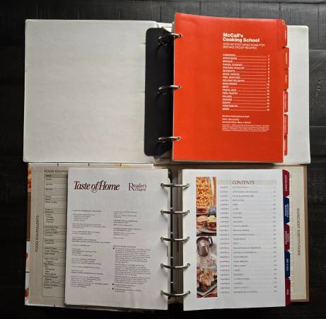 Each of these cookbook collections is filled with hundreds of recipes, photos, instructions, and information. They are in binders with removable pages and tabs for easy access to different sections.