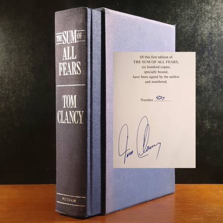 First edition, signed limited issue, 427/600. One of 600 copies signed by Tom Clancy on the limitation page at the front, specially bound. 798 pp. Bound in publisher's navy cloth with silver lettering. In publisher's slipcase, minor wear.