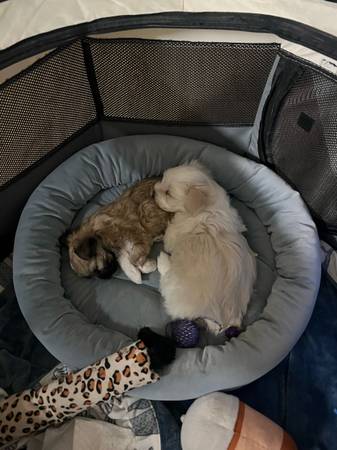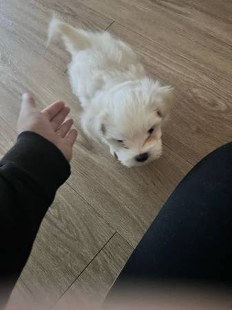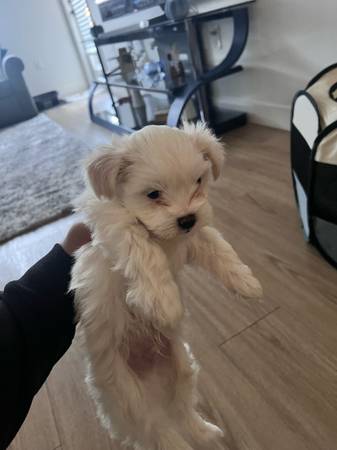 Selling my yorkie puppy boy only white one available good behaved puppy smart and playful and loving 600 or best offer want him to go to a good home
