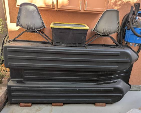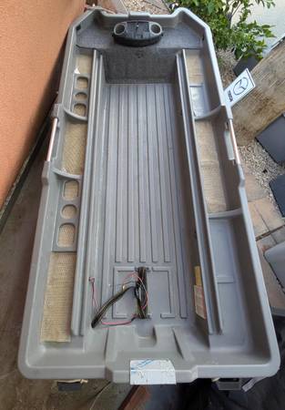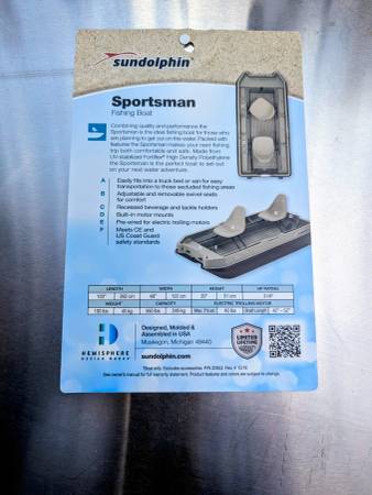 Sun Dolphin Sportsman 4'x 8' with Minn Kota Endora 40lb thrust electric motor. Deck and hull made of high density polyethylene. Has 2 removable and swivel seats, recessed beverage and tackle holders.