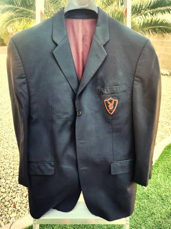 Own one of the Rarest, Awesome Playboy Patch ever (Still on a former Playboy Employee Suit Jacket). This was worn in the last Playboy Club in the United States by a Club Employee in Las Vegas (2006-2012). Check out the awesome detail on the Bunny Patch...There are embossed 'Bunnies' on the entire Patch! Try finding another like this patch..Below the awesome colored Bunny Logo it says 'CLUB' (it was worn by an employee in the club)...This coat (size 42R) is a serious piece of Playboy memorabilia that a collector must own for their collection...Imagine owning one of the last real, authentic Playboy coats in the United States with its awesome corporate 'Playboy Bunny Patch' in perfect condition still on it. The coat itself is definitely in need of repair, a piece of the inside back lining has been cut away (?), there is a stain above the breast pocket as seen (drycleaning solution?) and the pocket has loose threads on upper right side (left when looking at the photo), but PB collectors aren't likely to be interested in the coat as much as the Patch! The backside of the collar also meeds some repair....if the coat is wanted, with some minor fixes, the coat can be repaired....But the Patch alone is worth the price if not more.....(πΉπππππππππ πΆπππππ πͺπππππ ππππ ) Henderson location near Green Valley Pkwy & Horizon Ridge.