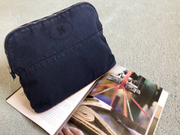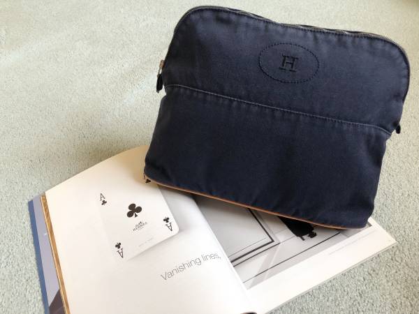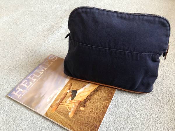 This beautiful authentic Hermes Women's Zip Top H Logo Bolide Cosmetic Pouch / Clutch /Hand Bag pouch Navy Blue Canvas, Lambskin Leather trim The overall is in excellent like new condition Made in...