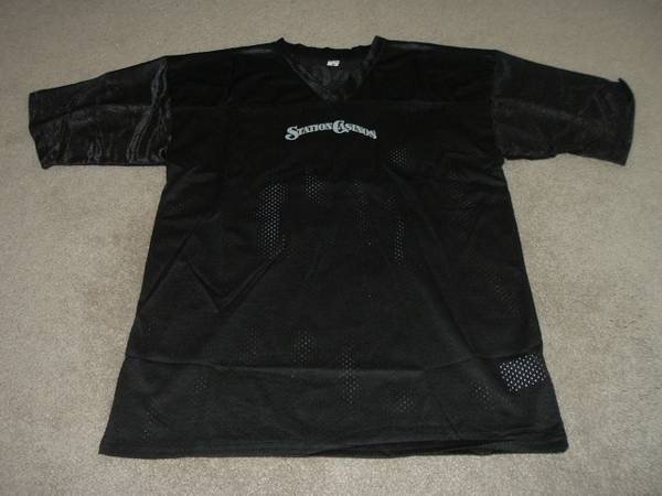 Brand new, never been worn, in original packaging. This Size Medium black mesh football jersey measures about 22 inches from underarm seam to underarm seam, and 30 inches from top of shirt to bottom hem. Has STATION CASINOS in curved white lettering across the front and back, with a large, white "76" on the back. Great collectible for any sports and Vegas casino fan