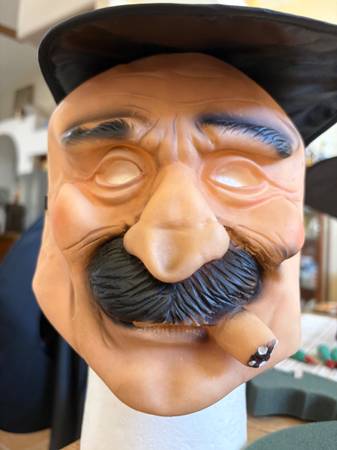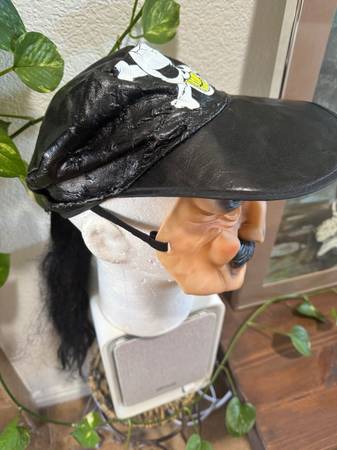 Halloween Rubber Latex? Mask and Hat set Mask - man with large mustache smoking a blunt cigar. Comes with black biker HAT with skull & cross bones and made to mimic Leather. Hat has an attached...