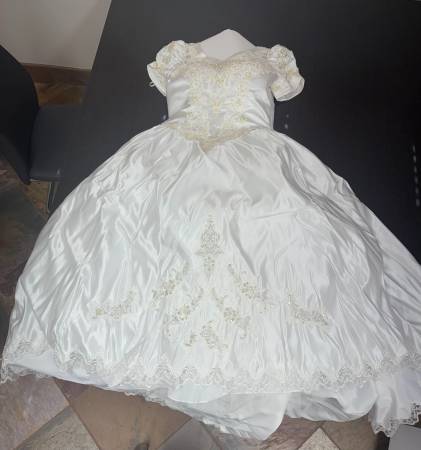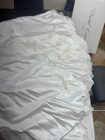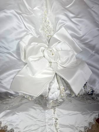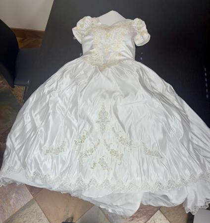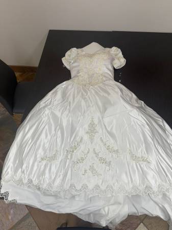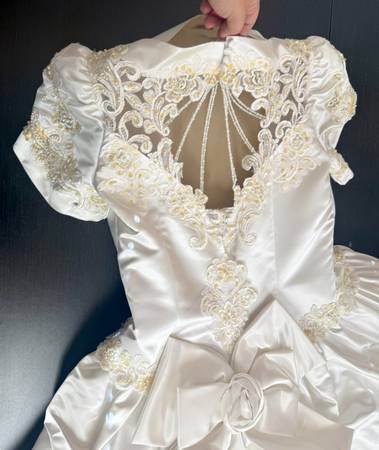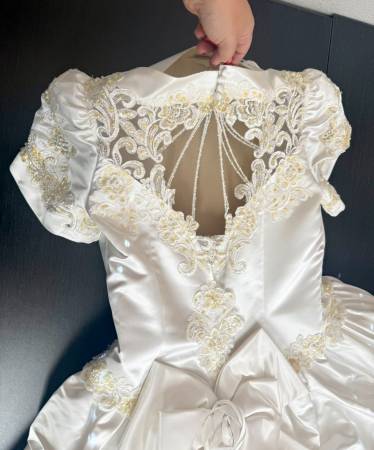 Discover a genuine treasure for your wedding day: a breathtaking vintage Lady Eleanor wedding dress, size 18, preserved in pristine condition. This gown remained in its original preservation box until recently, when it was carefully removed for these photographs. This Lady Eleanor gown is a stunning example of classic bridal design, featuring a rich, satin finish and a beautifully ornate bodice. The dress boasts intricate embroidery with sparkling sequins and delicate pearl beading, creating a luminous, elegant effect. The sweetheart neckline and cap sleeves are accented with the same detailed beading, adding a touch of sophisticated charm. The train carries through the same beautiful details featuring satin bows, pearl and sequins beading with delicate lace detailing. The gown is in excellent condition, a testament to its careful preservation. While the fabric is slightly wrinkled from its long storage, it simply needs a professional steaming to restore its flawless drape and ready it for your walk down the aisle. Embrace the romance of a bygone era and make this exquisite vintage Lady Eleanor dress your "something old." This unique piece offers the elegance of vintage design combined with a modern fit, perfect for the bride seeking a truly unforgettable gown. Details: * Brand: Lady Eleanor * Size: 18 * Condition: Excellent vintage condition. Needs professional steaming. * Features: Satin fabric, intricate sequin and pearl beading, embroidered bodice, sweetheart neckline, cap sleeves, and lace detailing. Don't miss the opportunity to own this perfectly preserved piece of bridal history. Contact us for more details or to arrange a viewing. Vintage wedding dress Lady Eleanor Size 18 wedding gown Preserved wedding dress Classic bridal gown Elegant wedding dress Satin wedding dress Bridal history “Somethin old”Beaded bodice Pearl details Sequin embroidery Intricate embroidery Sweetheart neckline Cap sleeves Ornate wedding dress Excellent condition Vintage pristine Vintage preserved Timeless elegance Needs steaming