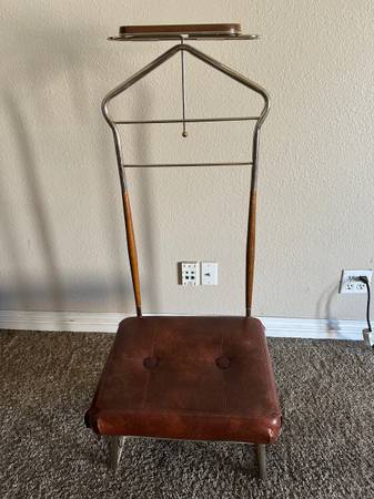 Valet Stand. Hang pants, jackets or coats, ties, etc. Padded seat for sitting to remove shoes. Traditional bedroom accessory. Cash Only