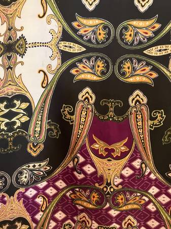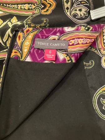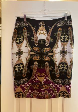 Baroque Paisley print fully lined zip-up back pre-owned straight skirt by Vince Camuto. It is knee length, 97% polyester, machine wash cold, perfect for any occasion, and in excellent condition.