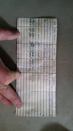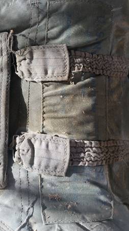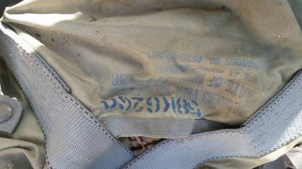 It was stored in a shed sitting on the floor outside Denver CO. Some leather straps and sewed marks appear to be deteriorated. Last checked 20 Dec 1987 as indicated on the placard.