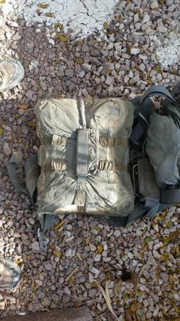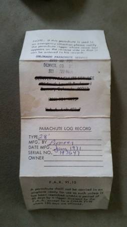 Please note from the pictures some discoloration on the parachute pack itself. It was stored in a shed sitting on the floor outside Denver CO, and the shed leaked in the rain, so the discoloration is from getting wet. Last checked 21 Feb 1986 as indicated on the placard.