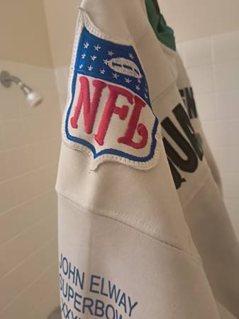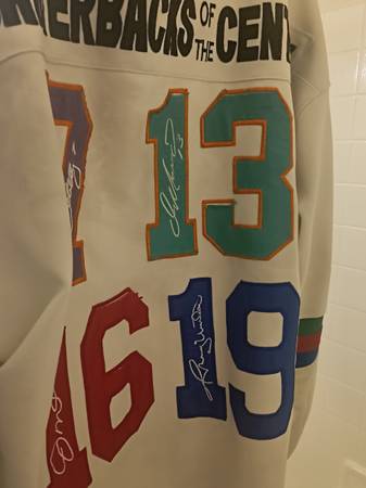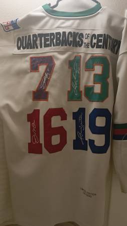 Authentic Mitchell and Ness 1997 jersey limited edition #1301 of 2003 being offered for sale or trade featuring John Elway, Joe Montana, Dan Marino, and Johnny Unitas. Produced in 1997 and in good condition for being 28 years old and primarily worn on special events as Super Bowl parties and conventions.