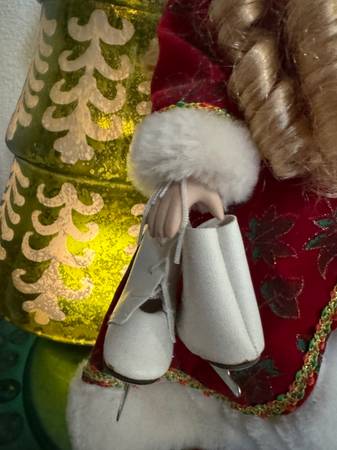 Beautiful vintage 2003 collectible porcelain doll in her winter coat and hat carrying her ice skates 17" tall In excellent new like condition No EMAILs or six digit or special codes or sending...