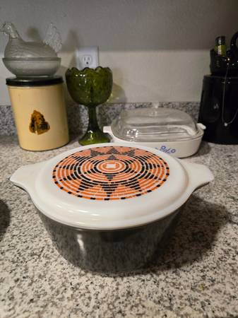 Each Pyrex honeysuckle casserole dish 033 $5 Pfaltzgraff au gratin $5 Pyrex promotional 475 pueblo with lid gone