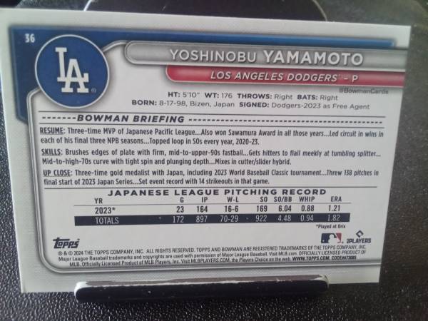 Yoshinobu Yamamoto 2024 Topps Bowman Rookie Card...Mint condition. The World Series MVP! A great addition to your card collection... Send Text