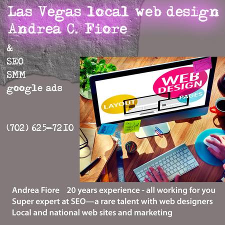 I'm Andrea Fiore, and I have lived in Las Vegas for over 25 years. I’m ready to talk over your project with you. Please give me a text, call or email soon. We'll send you our portfolio site (I work with one person, James Acker, the project strategist and designer and SEO expert) and other introductions. James and I have been working together on web design and build, SEO and other digital marketing channels, graphic design and content writing for 20 years.