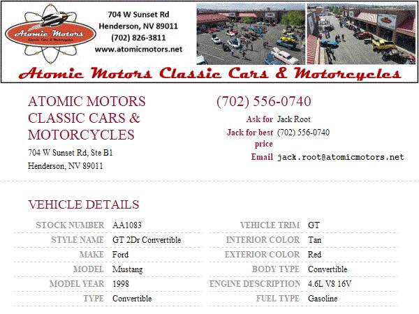 This vehicle is located at Atomic Motors Classic Car Sales and Restorations in Henderson, NV just 20 mins from the fabulous Las Vegas Strip. Come down and see us or call Jack for best price at 702-556-0740 or call our sales dept at 702-826-3811 ext 2 for general information. Additional pictures and videos may be found on our site at www.atomicmotors.net