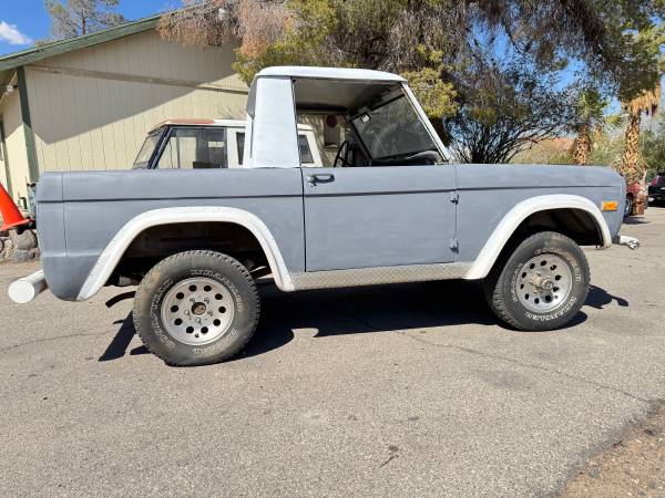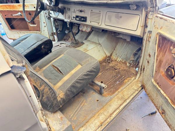Pretty solid rust free Bronco except Front Floor Pans. original 170 Engine upgraded to a 200. Engine runs and seems to be in good shape, but it will need fuel and brake system to be gone through to be drivable. Clean Title. Asking $17,999 OBO more flexible on the price without the rare half cab roof. I do have a full roof that is not perfect I am willing to swap out as well. $17,999