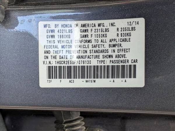 * Rear Spoiler * Modern Steel MetallicAutoNation USA Centennial has a wide selection of exceptional pre-owned vehicles to choose from, including this 2015 Honda Accord Sedan. The Honda Accord Sedan Sport speaks volumes about it's driver, uncompromising individuality, passion for driving, and standards far above the ordinary. It's exceptional fuel-efficiency is a clear sign that not all vehicles are created with the same standards. In addition to being well-cared for, this Honda Accord Sedan has very low mileage making it a rare find. This vehicle won't last long, take it home today. More information about the 2015 Honda Accord Sedan: The Honda Accord is a mid-sized car, competing against some of the best-selling vehicles in America. Prime competitors for the Accord include the Toyota Camry and the Nissan Altima. The Accord is a solid value, but with a capable and sophisticated chassis that can feel quite luxurious when properly optioned. This versatility allows it to be either a spacious alternative to many economy cars or a less expensive alternative to many luxury cars. There is even a stylish coupe available with performance that matches many sports cars. This model sets itself apart with variety of configurations available, Fuel efficiency, interior space, and long history of reliability This vehicle includes a Money-Back Guarantee* and has passed our precise inspection process. What does that inspection include? Our Worry Free Folder is in each vehicle and includes the complete inspection, along with the work that was completed to bring the vehicle up to AutoNation standards. A copy of the CarFax has also been included for you. Best of all the price you see is the price you pay. No haggling. No back and forth. No pressure. *Money-Back Guarantee is valid for 5 days or 250 miles, whichever comes first. Subject to certain terms and conditions. See store for details. Some restrictions apply.