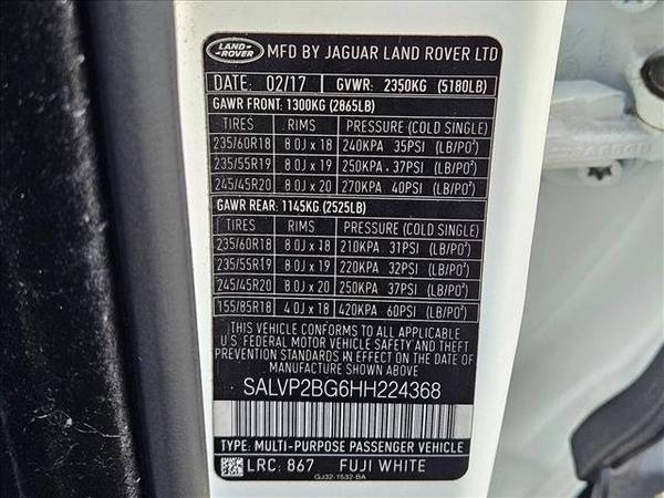 The following items have been reconditioned on this vehicle: new pair of tires! * Panoramic Roof * Leather Seats * Navigation System * Keyless Start * Rear SpoilerThis vehicle includes a Money-Back Guarantee* and passed our precise inspection process. Best of all the price you see is the price you pay. No haggling. No back and forth. No pressure. And this price is so good it is guaranteed. *Money-Back Guarantee is valid for 5 days or 250 miles, whichever comes first. Subject to certain terms and conditions. See store for details. Some restrictions apply.This 2017 Land Rover Range Rover Evoque SE Premium is offered to you for sale by AutoNation USA Henderson. Treat yourself to an SUV that surrounds you with all the comfort and conveniences of a luxury sedan. This Land Rover Range Rover Evoque SE Premium is for the discerning driver who demands the utmost of his vehicle. Taking the road less traveled has never been more fun than with this 4WD. With improved performance, mileage and acceleration, this 2017 4WD Land Rover Range Rover Evoque SE Premium is king of the off-road. The Range Rover Evoque SE Premium has been lightly driven and there is little to no wear and tear on this vehicle. The care taken on this pre-owned vehicle is reflective of the 67,384mi put on this Land Rover.