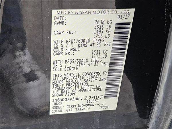 The following items have been reconditioned on this vehicle: new brakes! * [J01] Moonroof Package * Sun/Moonroof * Leather Seats * Navigation System * [C02] Federal Emissions * Magnetic Black * Steel; Leather Appointed Seat TrimThis vehicle includes a Money-Back Guarantee* and passed our precise inspection process. Best of all the price you see is the price you pay. No haggling. No back and forth. No pressure. And this price is so good it is guaranteed. *Money-Back Guarantee is valid for 5 days or 250 miles, whichever comes first. Subject to certain terms and conditions. See store for details. Some restrictions apply.2017NissanFrontier This Nissan includes: MAGNETIC BLACK [J01] MOONROOF PACKAGE Generic Sun/Moonroof Sun/Moonroof *Note - For third party subscriptions or services, please contact the dealer for more information.* This 4WD-equipped vehicle will handle majestically on any terrain and in any weather condition your may find yourself in. The benefits of driving an Four Wheel Drive vehicle, such as this NissanFrontier SL, include superior acceleration, improved steering, and increased traction and stability. The incredibly low mileage and painstaking upkeep on this Nissan Frontier makes it a once-in-a-lifetime deal that won't last long! Call us today to reserve your test drive! Just what you've been looking for. With quality in mind, this vehicle is the perfect addition to take home.
