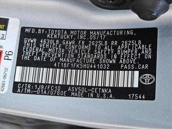 * Carpeted Floor Mats & Trunk Mat Package * Ash; Fabric Seat Trim * California Emissions * Celestial Silver MetallicThis vehicle includes a Money-Back Guarantee* and passed our precise inspection process. Best of all the price you see is the price you pay. No haggling. No back and forth. No pressure. And this price is so good it is guaranteed. *Money-Back Guarantee is valid for 5 days or 250 miles, whichever comes first. Subject to certain terms and conditions. See store for details. Some restrictions apply.You can find this 2017 Toyota Camry LE and many others like it at AutoNation USA Henderson. This Toyota includes: ASH, FABRIC SEAT TRIM Cloth Seats CARPETED FLOOR MATS Floor Mats CALIFORNIA EMISSIONS CELESTIAL SILVER METALLIC *Note - For third party subscriptions or services, please contact the dealer for more information.* When it comes to high fuel economy, plenty of versatility and a great looks, this ToyotaCamry LE cannot be beat. This Toyota Camry's superior fuel-efficiency is proof that not all vehicles are created equal. This 2017 Toyota Camry has such low mileage it has been parked more than driven. The Toyota Camry has been the best-selling car in America for twelve years now. The Camry is a massive success and with good reason -- it's got proven reliability, a quiet and spacious interior, good fuel economy and exciting exterior styling. For anyone who needs quiet, comfortable transportation for up to five people without breaking the bank, the Camry is invariably the place to start the search. The Camry offers a ton of versatility for the price, but can also be optioned up to give buyers that luxury car feel if they so desire. * Reliable * aggressive styling * comfortable * spacious * efficient