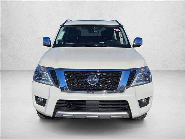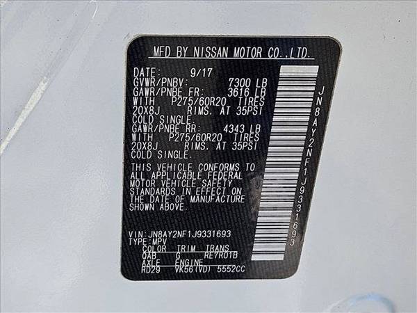 * Sun/Moonroof * Leather Seats * Navigation System * [X01] Captain Seat Package * 3rd Row Seat * [L93] Carpeted Floor Mats W/ Captain Seat Package * Lane Keeping Assist * Keyless Start * Rear Spoiler * Cooled Front Seat(S) * [C03] 50 State Emissions * Pearl WhiteThis vehicle includes a Money-Back Guarantee* and passed our precise inspection process. Best of all the price you see is the price you pay. No haggling. No back and forth. No pressure. And this price is so good it is guaranteed. *Money-Back Guarantee is valid for 5 days or 250 miles, whichever comes first. Subject to certain terms and conditions. See store for details. Some restrictions apply.Contact AutoNation USA Henderson today for information on dozens of vehicles like this 2018 Nissan Armada Platinum. This Nissan includes: [X01] CAPTAIN SEAT PACKAGE Rear Bucket Seats Bucket Seats [L93] CARPETED FLOOR MATS Floor Mats PEARL WHITE *Note - For third party subscriptions or services, please contact the dealer for more information.* Sure, every Certified Pre-Owned Nissan is rigorously inspected. However, a Certified Pre-Owned Nissan Armada Platinum from AutoNation USA Henderson offers complete peace of mind. Perfect for the on-the-go family, this Nissan Armada Platinum is an SUV everyone will love. With exceptional mileage, options and power, you'll insist on driving it on all your outings. Sophistication & understated luxury comes standard on this Nissan Armada Platinum. Well-known by many, the Armada has become a household name in the realm of quality and prestige.