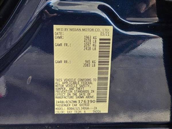 * [L93] Sr Floor Mats/Trunk Mat/Hideaway Nets * [B10] Body-Colored Splash Guards * [B93] Chrome Bumper Protector * [M92] Trunk Organizer Tray * Keyless Start * [C03] 50 State Emissions * Deep Blue Pearl * Sport; Sport Seat TrimThis vehicle includes a Money-Back Guarantee* and passed our precise inspection process. Best of all the price you see is the price you pay. No haggling. No back and forth. No pressure. And this price is so good it is guaranteed. *Money-Back Guarantee is valid for 5 days or 250 miles, whichever comes first. Subject to certain terms and conditions. See store for details. Some restrictions apply.Check out this pre-owned 2021 Nissan Altima we recently got in. Start enjoying more time in your new ride and less time at the gas station with this 2021 Nissan Altima. Low, low mileage coupled with an exacting maintenance program make this vehicle a rare find. There is no reason why you shouldn't buy this Nissan Altima 2.5 SR. It is incomparable for the price and quality. Beautiful color combination with Deep Blue Pearl exterior over Sport interior making this the one to own!