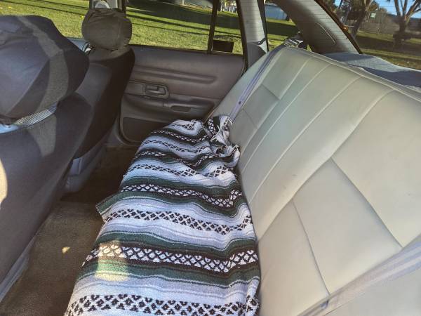cloth bucket seats,rear seat is leather,rubber floor mat no carpet,power driver seat,power windows and locks...all work as they should w no issues.headliner was removed when I got the car as it was shot from age and hot desert summers.