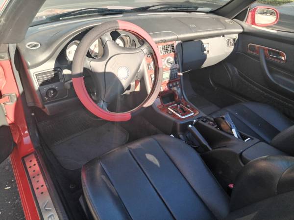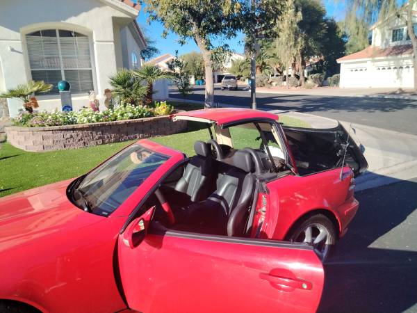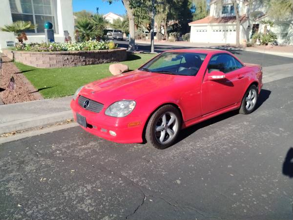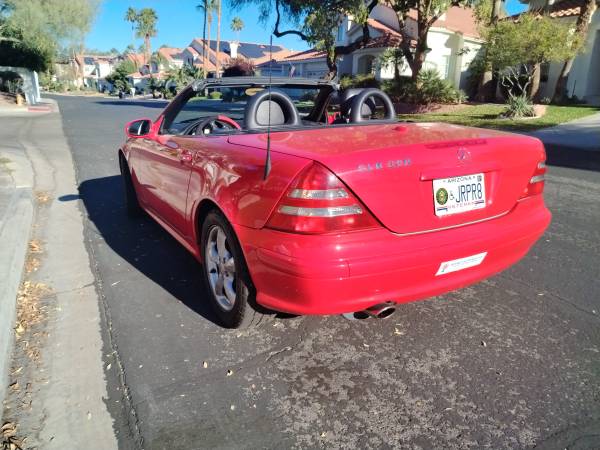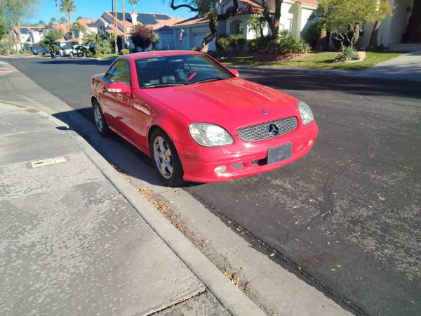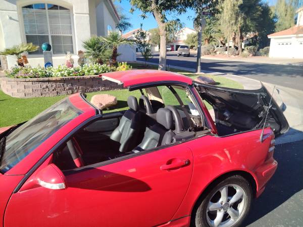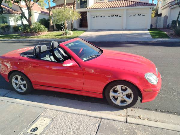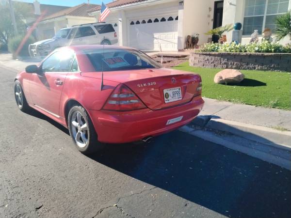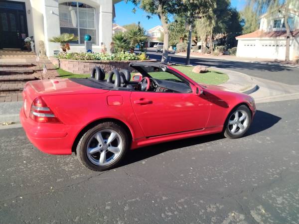 2001 MBZ SLK 320 RED hardtop convertible with beautiful Black Leather interior with wood trim. BF Goodrich Radial Sport tires with 5 spoke alloy wheels. 6 speed electric controlled automatic transmission, one touch retractible hardtop convertible. 6 way power seats, AM FM WB cassette CD stereo with 6 speaker Bose sound system. AC, Cruise control, anti theft alarm and dual integrated roll bar factory system. Loaded with factory window sticker showing original cost $47,040.00. Beautiful condition and ONLY 88,800 miles. Always garage stored in very nice one owner LIKE condition. Must sell due to US Army Veteran 100% disability. Located in Henderson, NV. Telephone calls to my home phone leave message show contact info