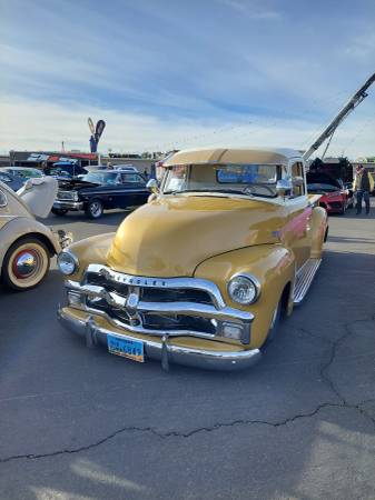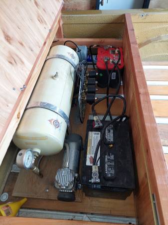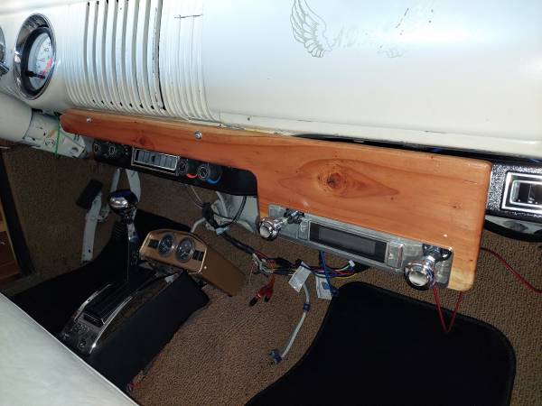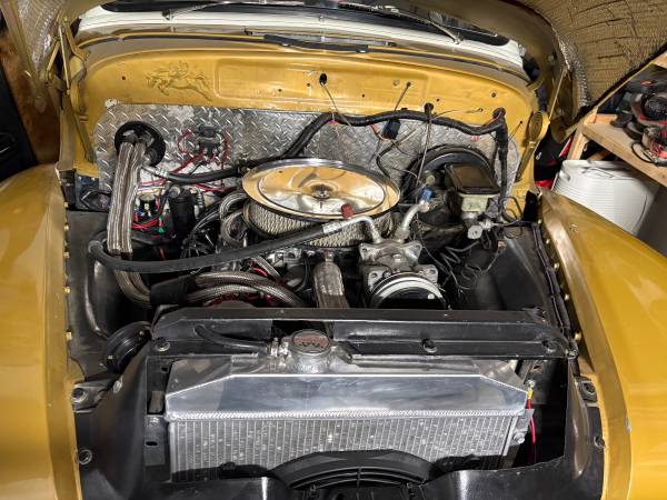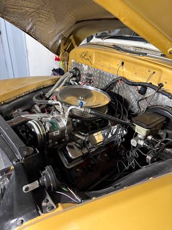 350 V8, automatic with AC. Air ride suspension, new electric fan, new tires. Love her but I just don’t have the skills to get her where I want her. Lots of blood sweat and tears. New chrome running...