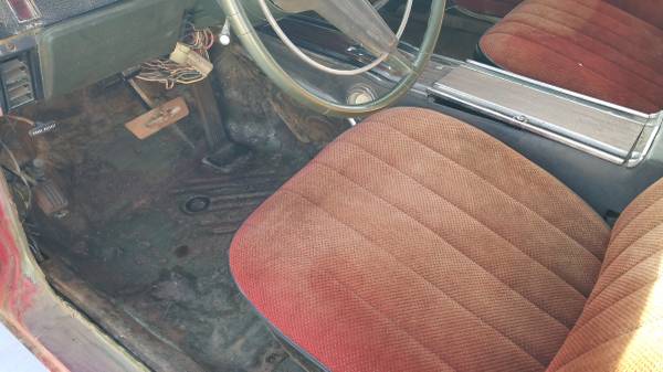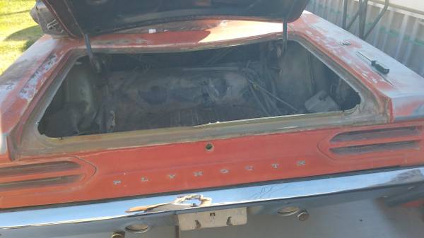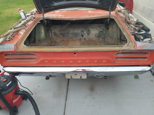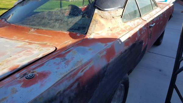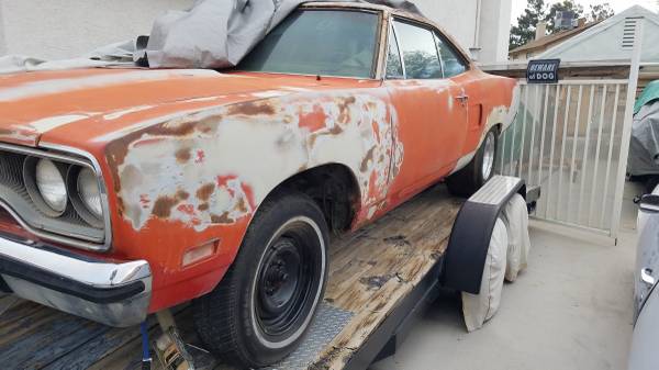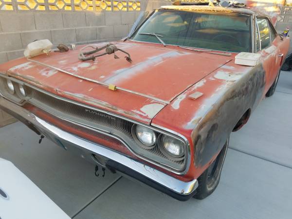 1970 Road Runner. Good body. Minimal rust. Rust on roof skin from vinyl top. Car has a replacement AMD roof skin added with sale. Trunk floor and cab floor in good shape. I have a date correct 383-2bbl. Complete and 727 trans to go with the vehicle that has had a freshen up not too long ago. Car is factory a/c and power steering. All components like drive- shaft, trim and interior are there. I don't have time to start and finish the restoration. Car was hit on driver side qtr. sometime in the past and will need final massaging. Car is originally a F8 green. Asking 25 K