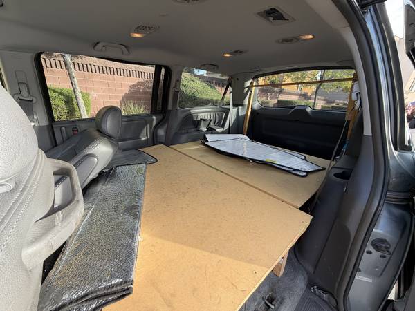 Converted to camper: all rear seats removed, flat plywood deck with full-size mattress platform. Comes with full set of custom blackout window covers — perfect for weekend trips or van-life