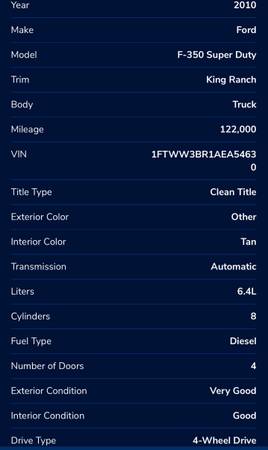 2010 ford F-350 Super duty long bed 4 door 4x4 FX-4 PRE DEF turbo Diesel King ranch addition. 122k miles. In good condition over all. Everything work as it should. Every power option available for the year. Heater leather seats. Good chunky tires. No dents, no rust, no fading paint, no major cosmetic issues. To many power options to list. Clean title in hand. Motivated seller. $24500 or best within reason offer. In person of course. It needs a tailgate. I don’t text and I will not be scammed I don’t need help selling it.